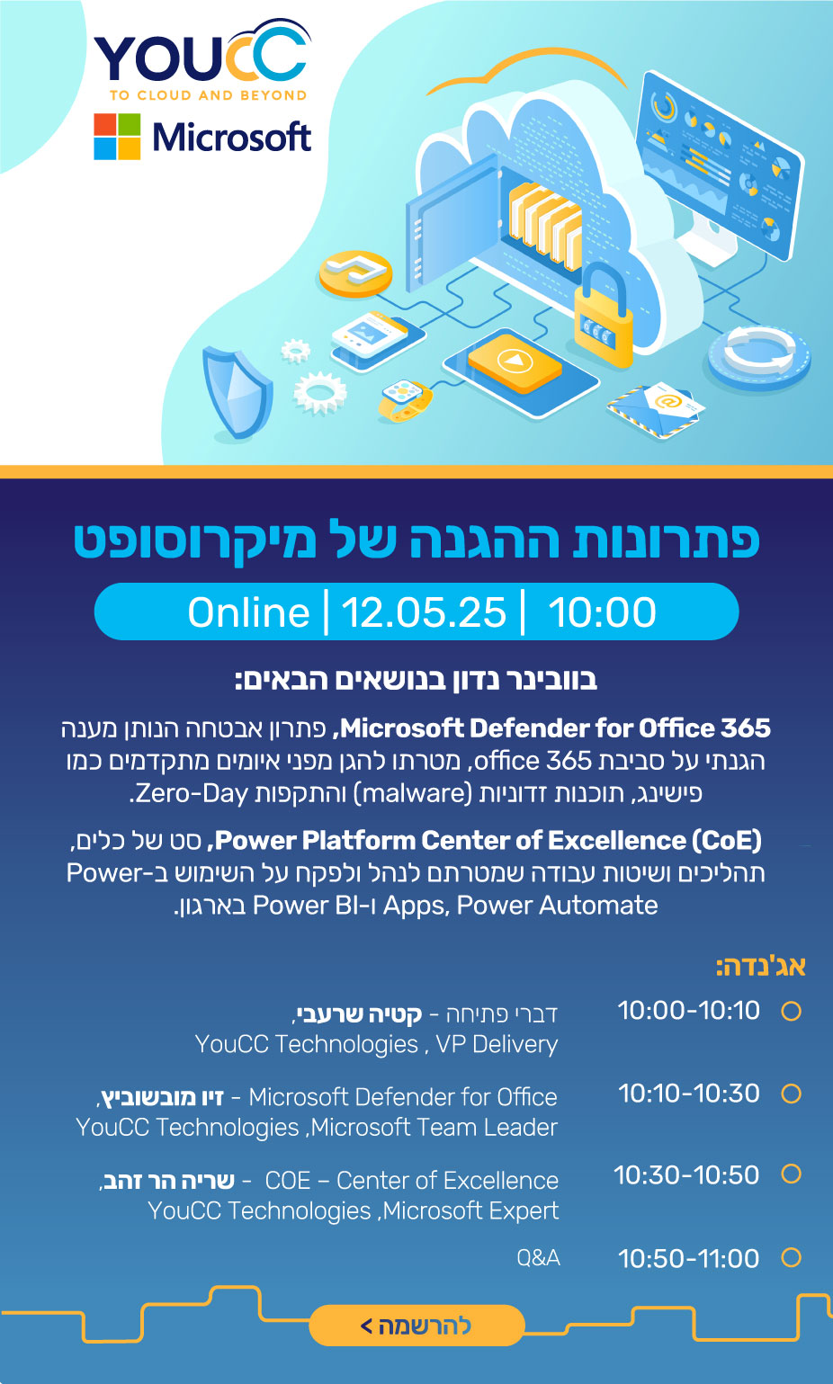 מומחי YouCC טכנולוגיות יציגו בוובינר את הנושאים הבאים: Microsoft Defender for Office 365 , פתרון אבטחה הנותן מענה הגנתי