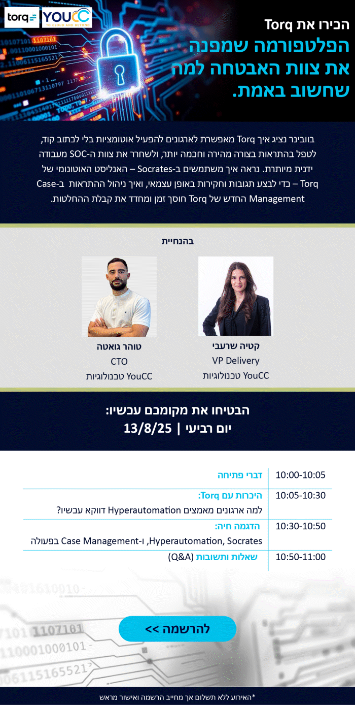 בוובינר הציגו מומחי YouCC טכנולוגיות איך Torq מאפשרת לארגונים להפעיל אוטומציות בלי לכתוב קוד, לטפל בהתראות בצורה